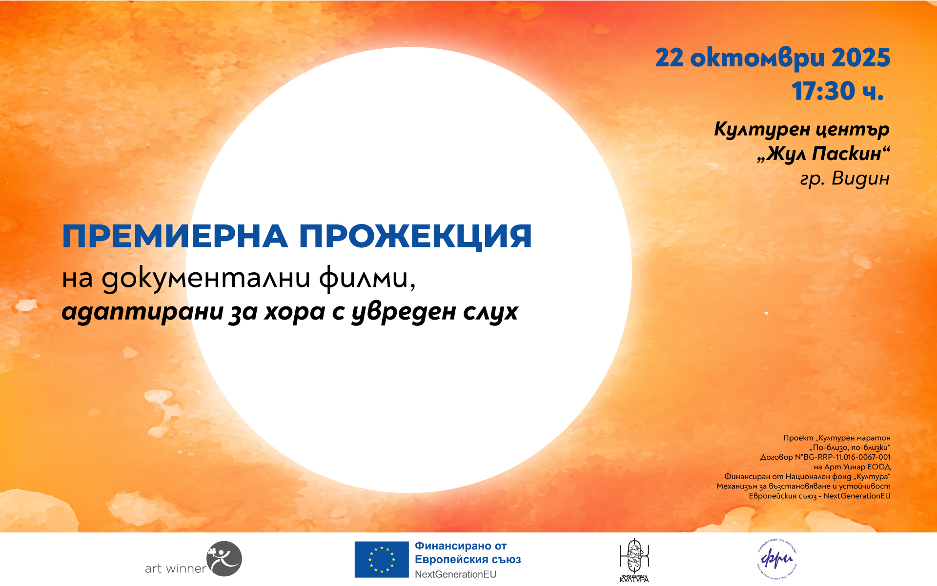 The screening was part of the Festive Program of Vidin Municipality celebrating Dimitrovden – the city’s holiday – as well as the project “Cultural Marathon – Closer, Closer,” implemented by Art Winner Ltd. with the support of the National Culture Fund under the European Union’s Recovery and Resilience Facility – NextGenerationEU.